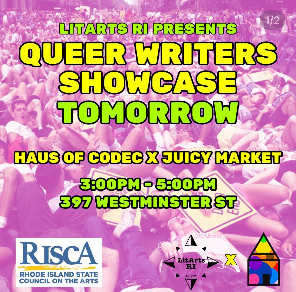 Event poster with rainbow text advertising the LGBTQQIA+ Queer Writers Showcase in June 2025 with LitArts RI hosted by the Haus of Codec Pride Marketplace. Mx. Asher read at this event.